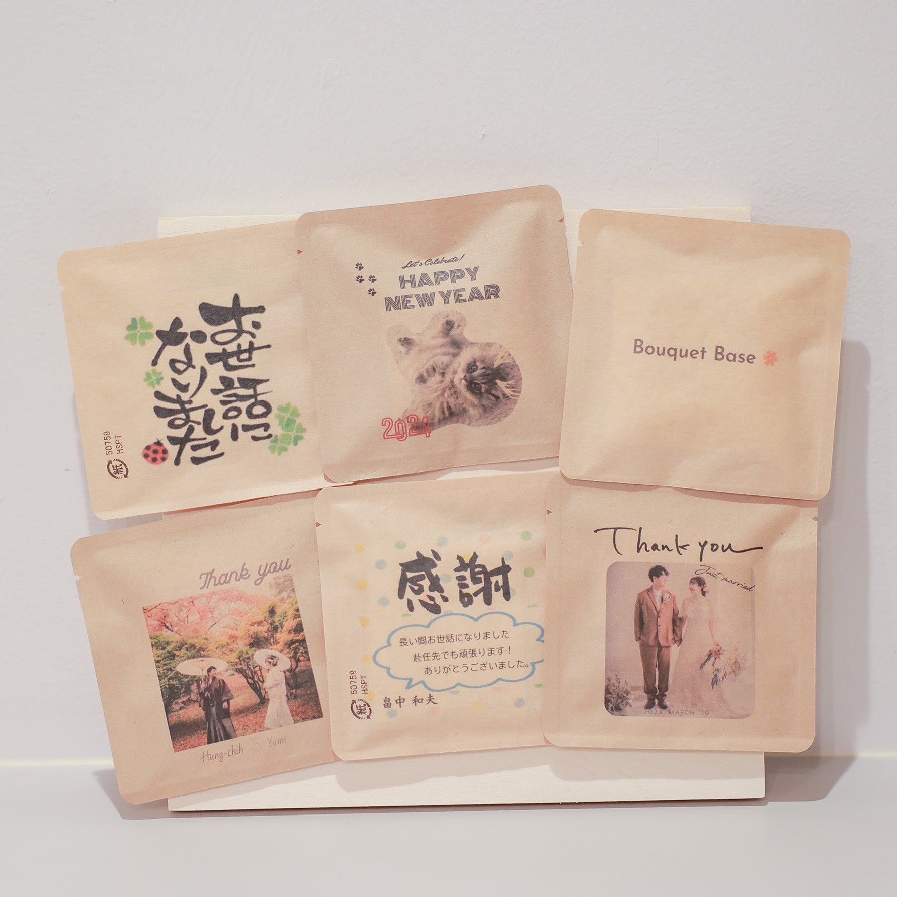 結婚式やお子さまの成長などのプチギフト、周年やイベント用、お店のロゴや社名を入れたプロモーションツールとして、オリジナルのドリップバッグはいかがでしょうか?
