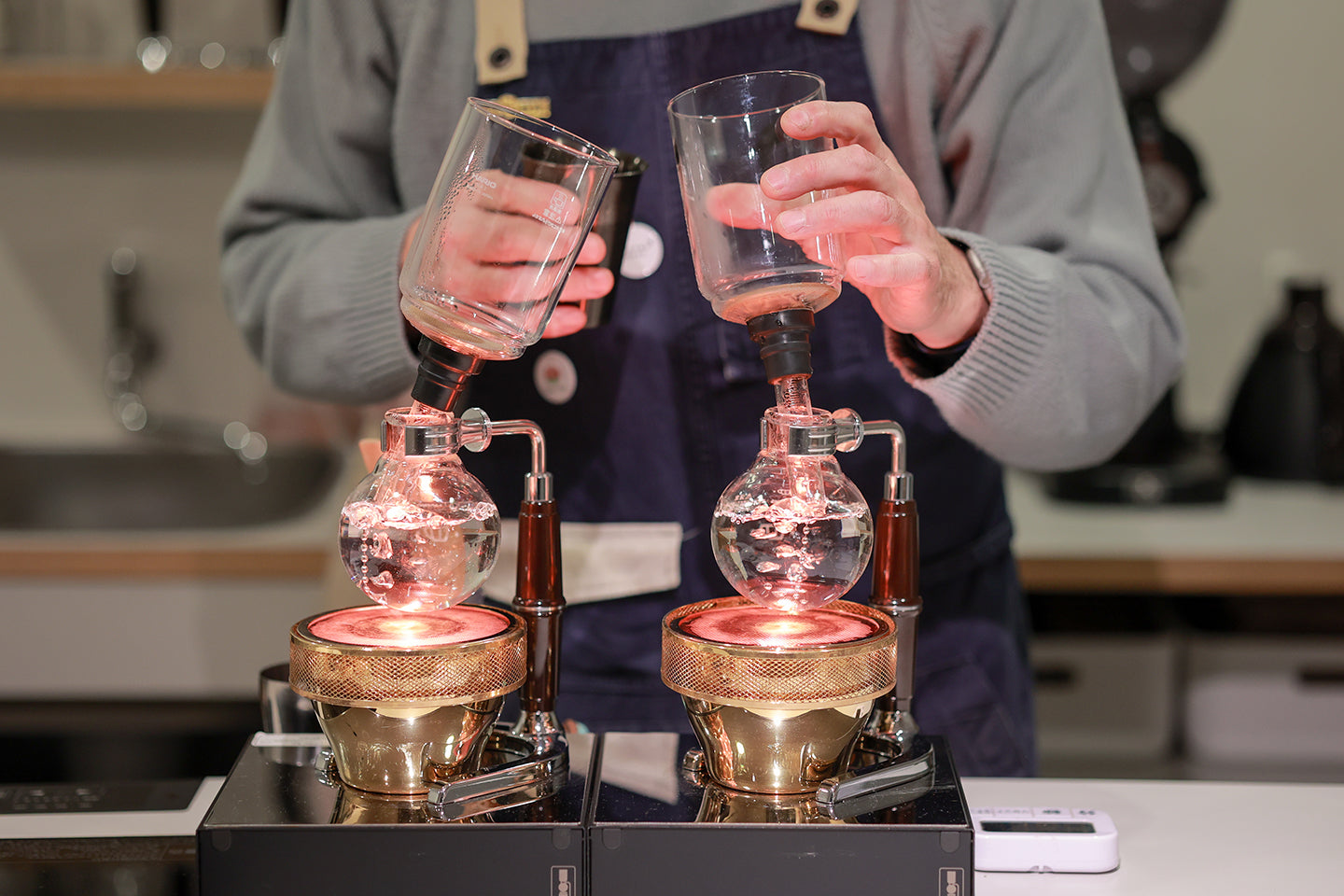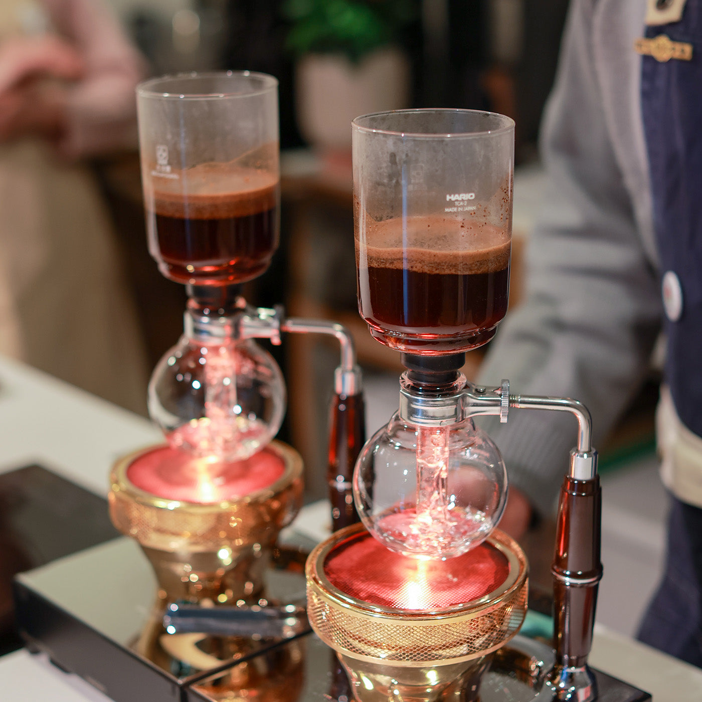 ポコポコと音を立てながらコーヒーを抽出するサイフォンの心落ち着くゆったりとした時間をお過ごしいただいたあと、引き立てのコーヒー豆の香り、味わいをお楽しみください。